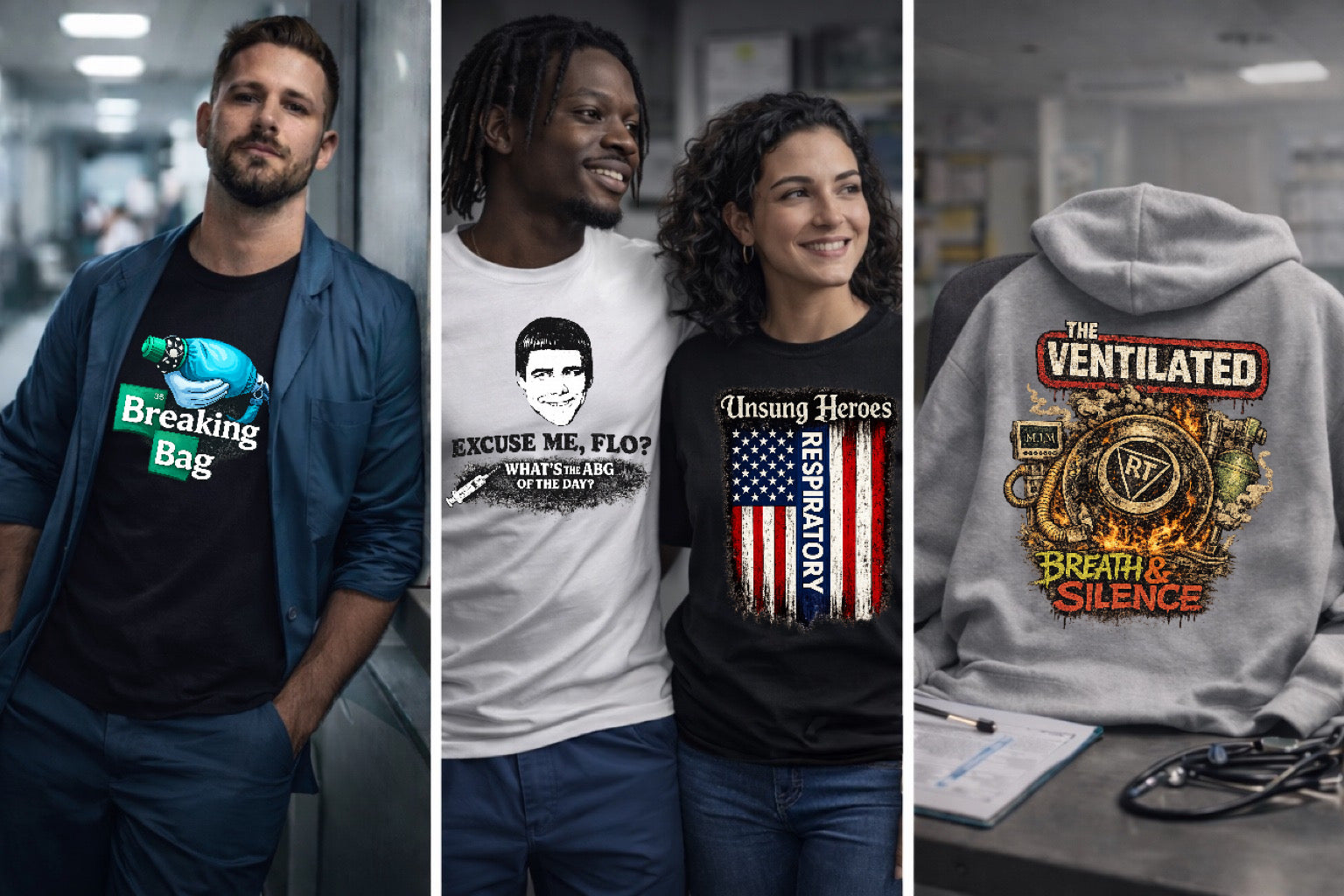 Apparel and gear inspired by Respiratory Therapists, airway teams, and critical care professionals. Designed for comfort on long shifts and pride off the clock.