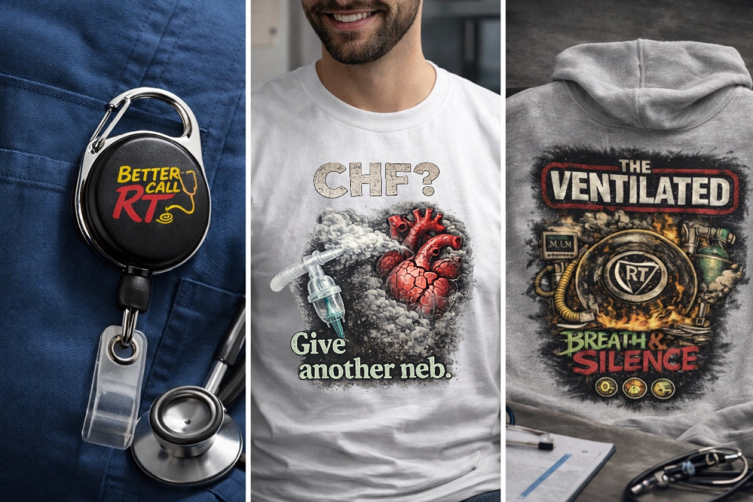 From badge reels to hoodies and tees, every design celebrates the work RTs do every day, saving breaths, supporting patients, and keeping hospitals running.